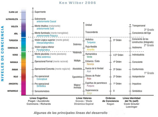 - Nivel 6 (verde), pluralista, conjuntiva, relativista. Se superan paradojas y relativismos, se trascienden los símbolos heredados de la cultura de origen. "Esta etapa implica el abrazo e integración de los opuestos y las polaridades en la vida de uno. Significa darse cuenta, tanto jóvenes como viejos, que la juventud y la acumulación de edad se mantienen juntas en la misma vida... Significa aceptar el hecho de que somos personas constructivas y, inadvertidamente, personas destructivas. Pablo capturó esto en Romanos 7, cuando dijo: "Porque no hago el bien que quiero, pero el mal que no quiero es lo que hago". "¿Quién me rescatará de este cuerpo de muerte?". Esta visión de la espiritualidad está realmente interesada en la reconciliación y la no marginación. Por eso no se limita a aceptar y tolerar pasivamente otras religiones, sino que a menudo las abraza activamente y trata de entenderlar e incorporarlas a su visión del mundo. Aunque sigue creyendo que su postura pluralista es la única verdadera, cayendo en la contradicción de creer que su visión es superior en un mundo en el que ellos mismo niegan que exista nada superior o inferior. En la espiritualidad pluralista se advierten las verdades importantes en todas las religiones, e incluso puede tener una espiritualidad desde el ateismo o el agnosticismo (lo cual también puede pasar en el nivel anterior). Rechaza toda jerarquía, y se manifiesta a favor de los oprimidos y desfavorecidos, tiene una clara sensibilidad medioambiental (ecocentrismo) y planetaria, y está especialmente abierta al misticismo natural y al Espíritu en tercera persona o Gran Eso, como la Gran Red de la Vida. Como rechaza todo tipo de jerarquía, fracasa miserablemente en distinguir las jerarquías de dominio (que son realmente aborrecibles), de las jerarquías de desarrollo (que son sanas y naturales). En las jerarquías de dominio u opresión, los pertenecientes a un nivel superior, oprimen y dominan a los muchos de los niveles inferiores, aunque una jerarquía natural de actualización o desarrollo, por poner un ejemplo, nos conduce desde los átomos hasta las moléculas, las células y los organismos. A esas jerarquías naturales, Koestler las denominó holoarquías, pues cada nivel más elevado no oprime al anterior, sino que lo incluye y abarca. Y la visión pluralista postmoderna, al no entender eso, incurre en el error catastrófico de deconstruir y destruir también toda jerarquía de desarrollo, un auténtico desastre cultural y espiritual.