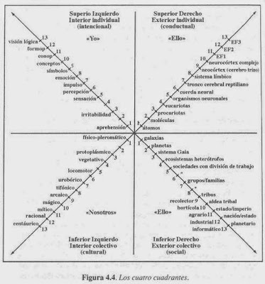 - Nivel 7 y 8 (esmeralda y turquesa), universal, holista, integral. Tracendentes de culturas y credos. Socialmente proactivo y propositivo de ideas que rompen con lo establecido. "Más allá de la paradoja y las polaridades, las personas en la etapa de la Universalización de la fe, están basadas en una unidad con el poder del Ser, Espíritu o Dios. Sus visiones y compromisos parecen liberarlos en una inversión apasionada pero desapegada del yo en el amor. Tales personas están dedicadas a superar la división, la opresión y la violencia, y viven en una respuesta anticipada efectiva a una comunidad de amor y justicia que unifica, la realidad de un reino de Dios fragmentado". Las personas que se encuentran en ese nivel de inteligencia espiritual, están impulsadas a encontrar pautas que conectan, a descubrir la unidad que subyace a la diversidad, la totalidad que acompaña a la parcialidad y la unidad que hay detrás de toda multiplicidad. Se tiene reconocimiento de las importantes contribuciones realizadas por los niveles y visiones anteriores. Reconoce que cada etapa del desarrollo trasciende e incluye a sus predecesoras. Cada etapa es una totalidad y a la vez parte (un holón) y la jerarquía anidada resultante es una jerarquía de desarrollo (o jerarquía holónica, que podemos llamar holoarquía). Entonces, dándose cuenta de la naturaleza holoárquica de todas las cosas, la visión integral reconoce estar estrechamente interconectada con todo el universo. Cada nuevo momento es fresco, espontáneo y vivo. Ahí se reconocen e integran las dualidades como conocimiento y sentimiento, conciencia y ser, y epistemología y ontología, no las ve separadas y no trata de fundamentar a una por la otra, sino que las ve y siente como aspectos complementarios de la misma Totalidad. Cualquier cosa, evento o ser, puede ser visto desde diversas perspectivas: interioridad, exterioridad, individualidad, colectividad. Si combinamos estas 4 perspectivas de la realidad, obtenemos lo que Wilber denomina "Los 4 cuadrantes del Kosmos". Los niveles holista e integral no se limitan a tolerar pasivamente las visiones de las etapas anteriores, sino que las admiten activamente y dejan, para ellas, el suficiente espacio, pues aunque no estén completamente de acuerdo con ellas, entienden que tales estaciones o etapas son parte del camino del desarrollo. Además comprenden que la persona tiene el derecho a detener su su desarrollo en cualquier estación o nivel (mientras sea en una versión sana, pues todos los niveles tienen sus posibles patologías). Así pues, una sociedad realmente inclusiva, debe dejar espacio suficiente para la gente conservadora de nivel ámbar, para la gente orientada al logro del nivel naranja, para los valores postmodernos del nivel verde... y procurar la convivencia pacífica en una misma comunidad de esas diversas maneras de ver el mundo. Puedes ver ti ciudad como un gran pastel de capas diversas de ver el mundo. Los nivel verde están en lucha constante con los conservadores ámbar, con los capitalistas naranja, y se irritan cuando los integrales les dicen que hay jerarquías buenas, por tanto la mentalidad de nivel pluralista verde no sirve para liderar armoniosamente ese pastel de capas de nuestra sociedad. Los niveles holista e integral son los primeros que aportan una visión de comprensión de la necesidad de cuidar toda la espiral del desarrollo, de cuidar inclusivamente todos los estratos. Y esa capacidad es algo tan novedoso que es imposible de exagerar lo importante que es su expansión y divulgación, pues puede conducirnos a ir resolviendo las crisis que vemos en nuestro mundo globalizado. Esa visión supone un extraordinario salto de significado a la que los teóricos como Graves llaman conciencia de segundo grado, porque es la primera visión de la realidad que realmente no está en "guerra" con los demás sistemas de valor o capas del desarrollo. Eso es realmente nuevo, épico y revolucionario, sin precedentes.