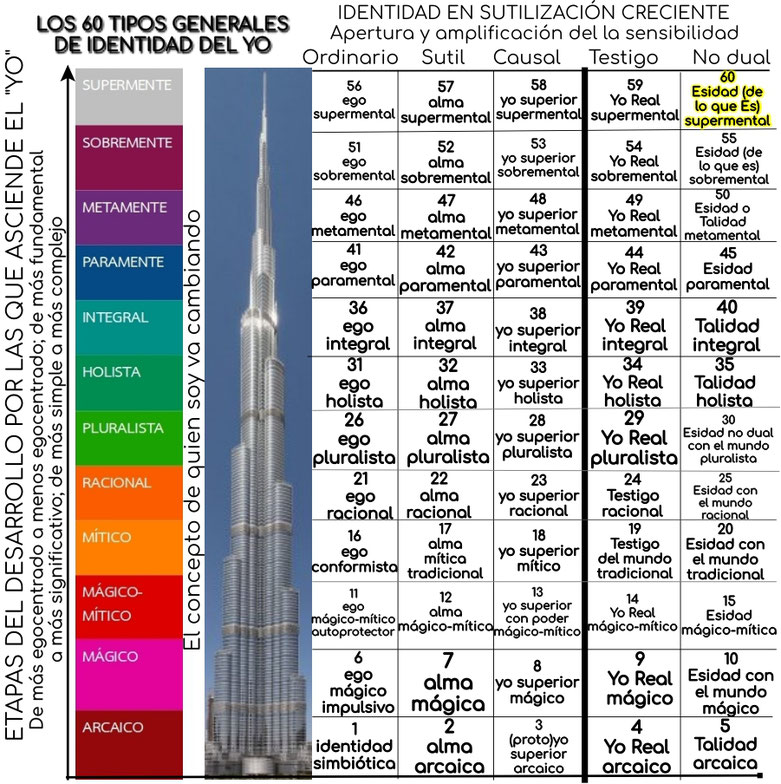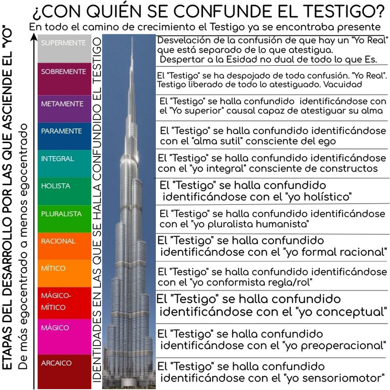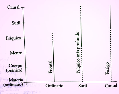 El ego o yo frontal es el yo que se adapta al estado ordinario; el alma (o psíquico profundo) es el yo que se adapta al estado sutil; el yo superior es la identidad adaptada a lo muy muy sutil que es lo causal; y el Yo Real o Testigo es el yo que se adapta al estado de Testigo Vacío.
